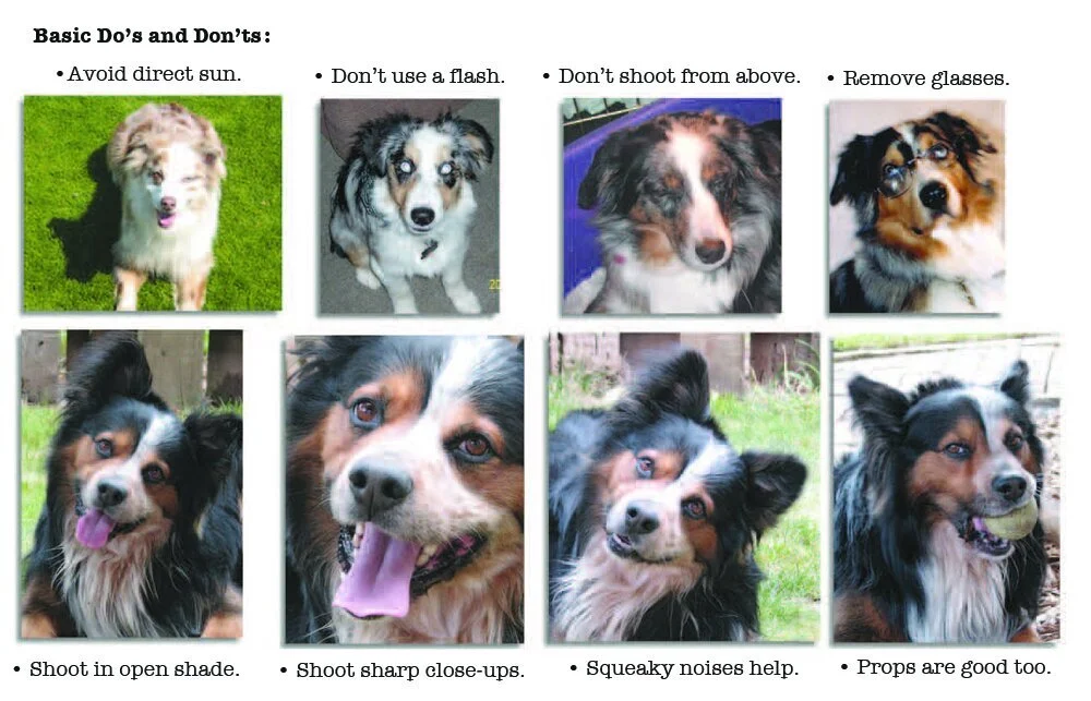 • When possible, shoot photos outdoors in full shade or under overcast skies, so the light is uniform, and doesn’t cast heavy shadows that can hide the features of your dog’s face.