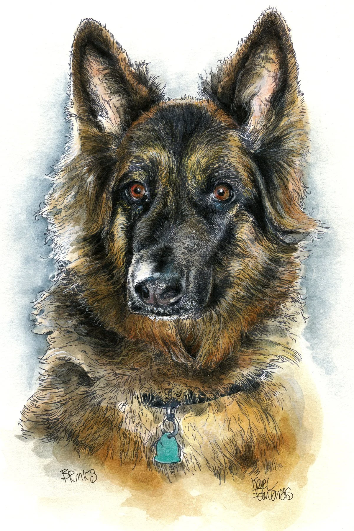 Brinks is a long-haired German shepherd I recently painted. Brinks’ owner gave me permission to reprint her emails to demonstrate the paramount importance of our dialogue throughout the process to achieve the most successful portrait.